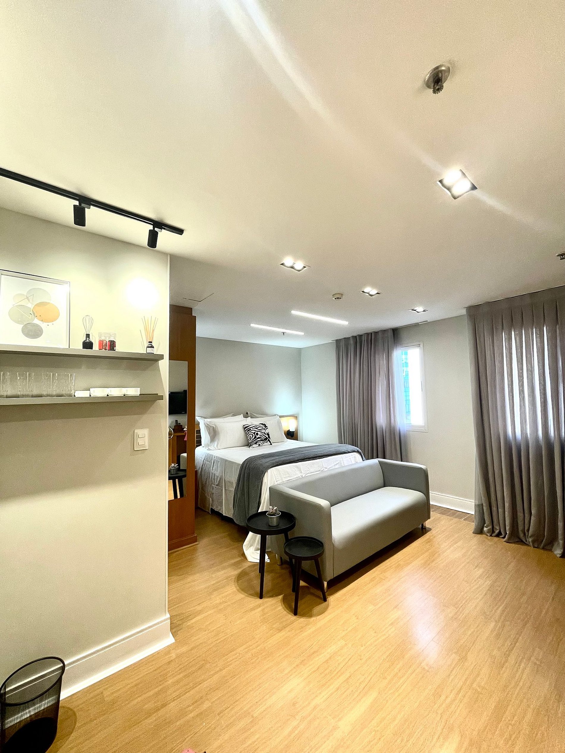 Possui também, sofá cama e colchão de solteiro adicional. Além de tudo isso, possui mesa específica para área de trabalho com cadeira confortável para os dias de home office, dispõe de ar condicionado, roupa de cama e banho, e serviço de arrumação diária.